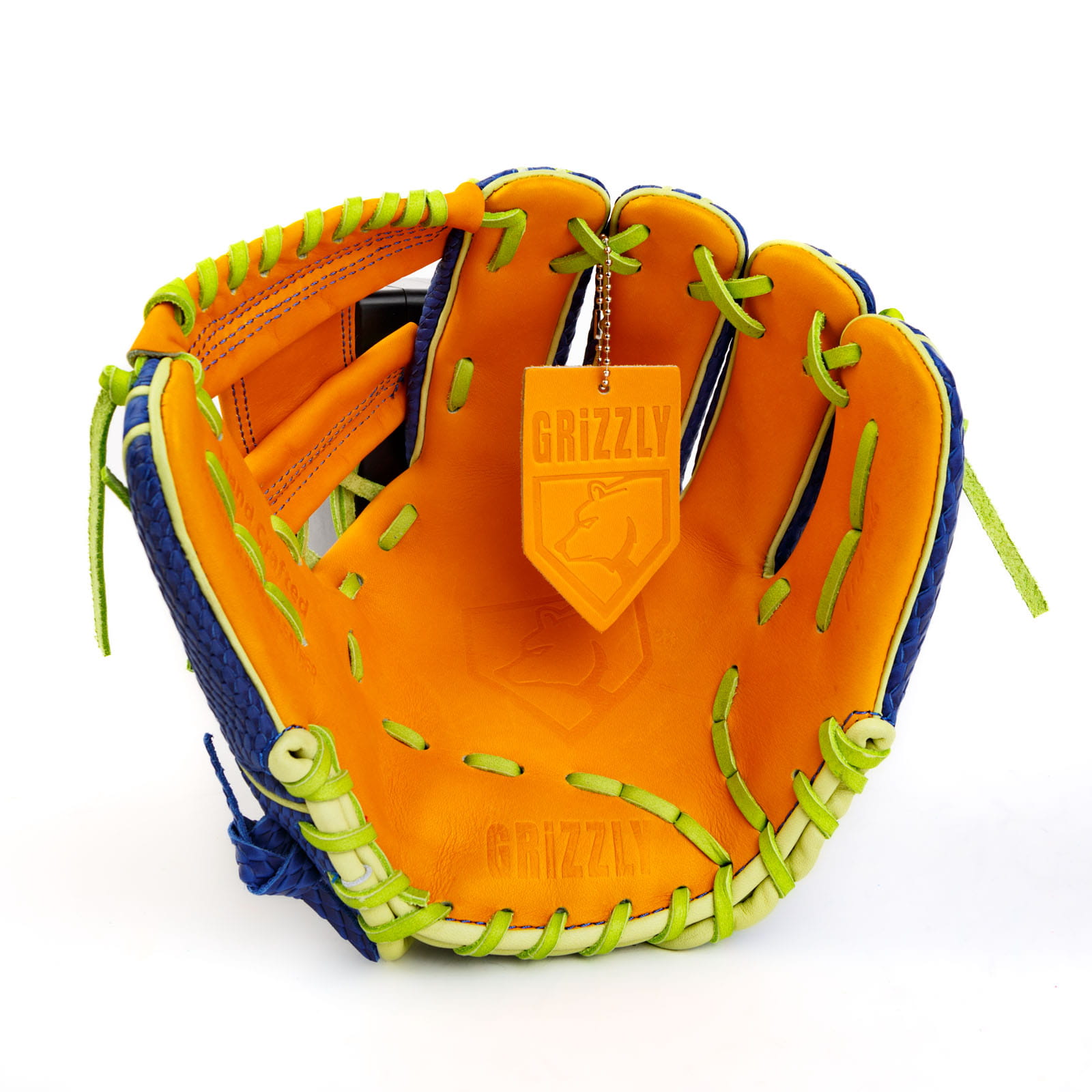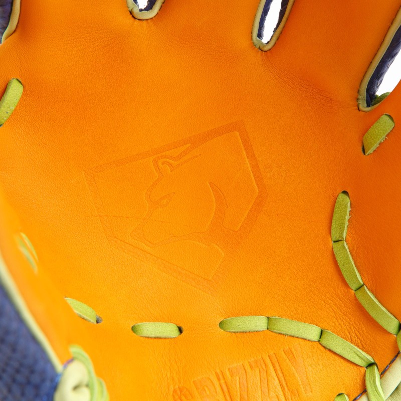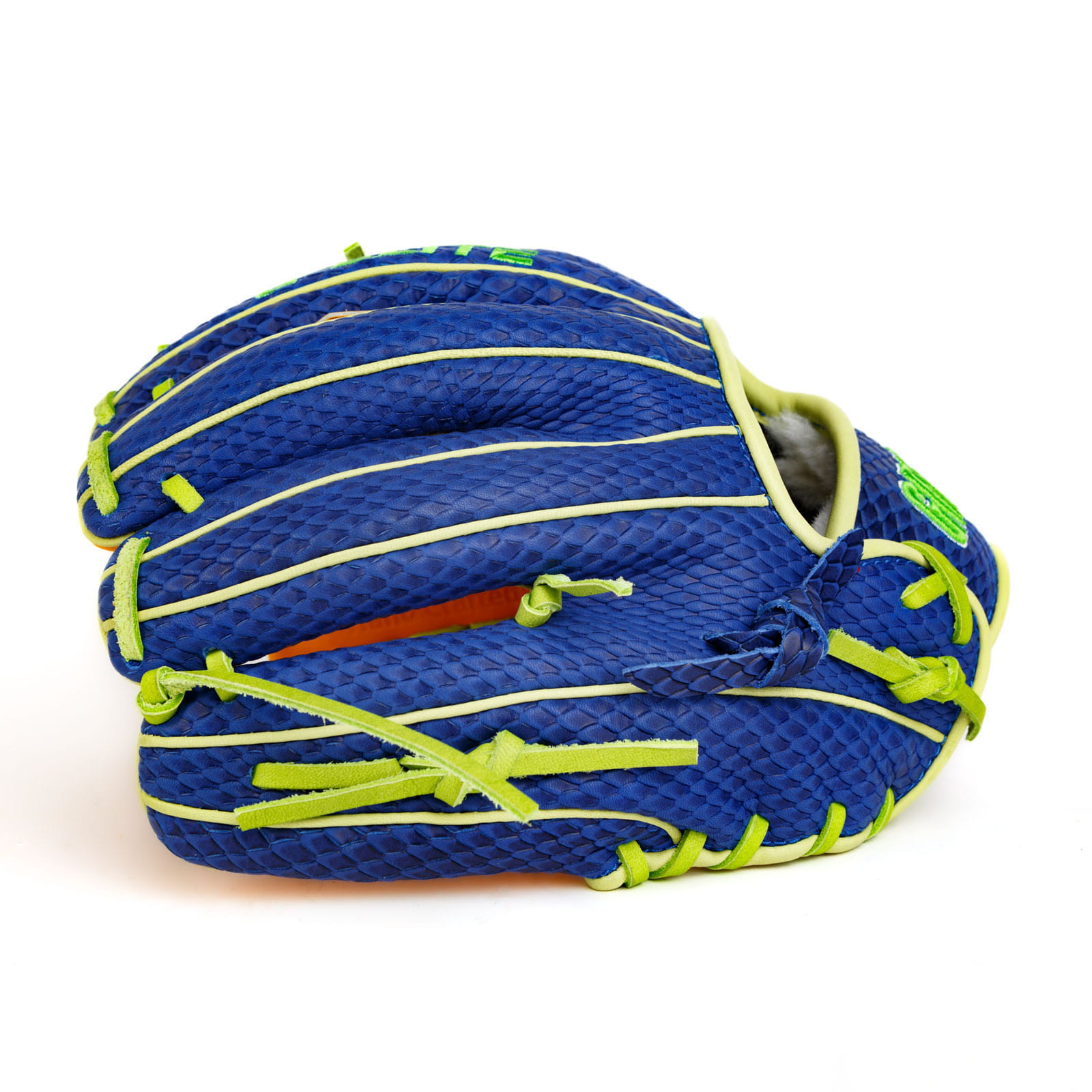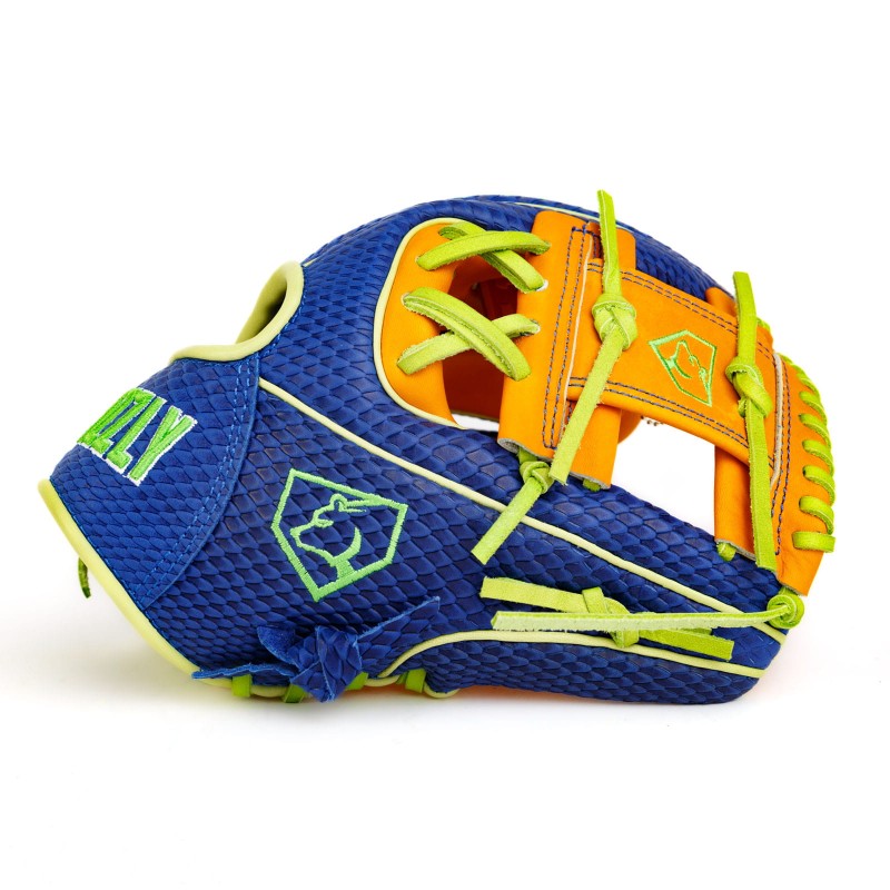 Constructed from premium Japanese kip leather, the Gummy Bear Glow glove offers exceptional feel, durability, and quick break-in time. The glove features a textured royal blue snakeskin-style back, contrasted by a vibrant orange palm and highlighter-green laces, giving it a candy-inspired look that’s impossible to ignore.